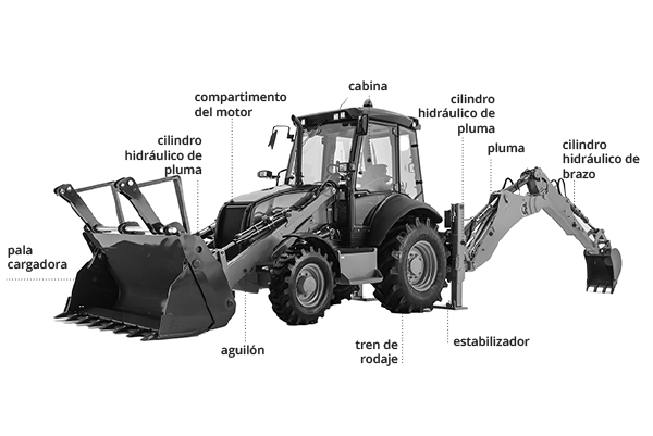 Posee un cazo para excavación ubicado en el extremo de un brazo articulado en dos partes diferentes. Por lo general, este brazo se coloca en la parte posterior de un tractor y se usa en obras de tierras, para realizar construcciones, tuberías y drenajes.